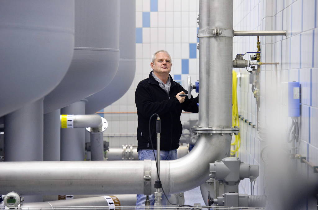 Das Wasserwerk Breetze erhält sein Rohwasser aus drei Brunnen, die zwischen 120 und 150 Meter tief sind und mitten im Wald liegen. Die Grundwasserkörper werden dabei aus Regen gespeist, der im Boden versickert. Dabei wirkt der Waldboden als großer Wasserspeicher. Alles Wasser, das über die Speicherkapazität hinaus geht, fließt gefiltert in den Grundwasserkörper ab, aus dem das Trinkwasser gewonnen wird, das später zu Hause aus dem Wasserhahn fließt. „Zwar könnte man bereits das gewonnende Rohwasser trinken, doch etwa zum Wäschewaschen würde es sich kaum eignen. Es sei denn, man ist bereit, die Wäsche anschließend zu bleichen“, erklärt Betriebsleiter Jürgen Lütgens. „Denn das Rohwasser ist relativ eisen- und manganhaltig.“ Das wird im Wasserwerk Breetze in acht großen Filterbehältern mit einem Volumen von je rund 40 000 Litern behandelt. „Beispielsweise zur Enteisung führen wir dem Rohwasser technischen Sauerstoff zu, die Eisenanteile oxidieren, das Wasser rostet quasi. Die Rostpartikel werden anschließend herausgefiltert.“