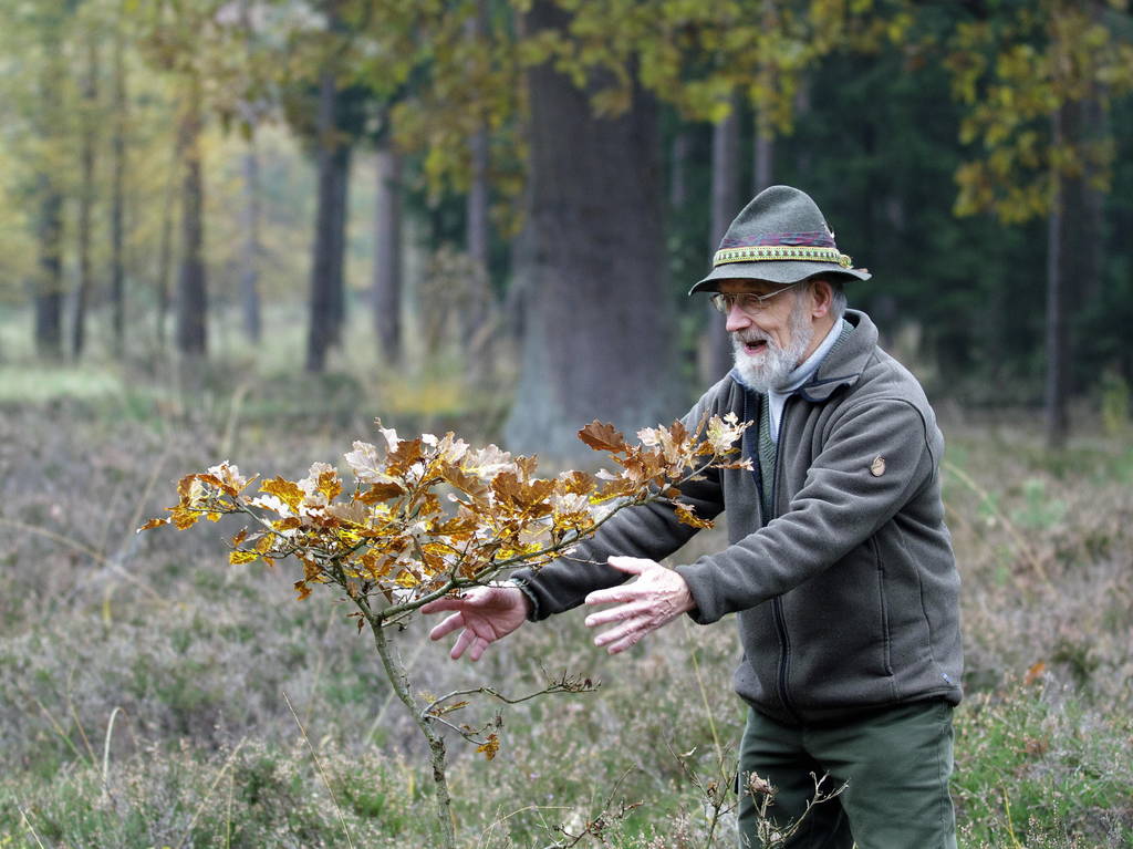 Der Forstexperte ist immer im Training. „Baumarten versuche ich, von Weitem zu erkennen. Schauen Sie, die Stieleiche hat zum Beispiel eine gröbere Borke als die Traubeneiche.“ Peter Brauer steht im Breeser Grund, der letzten offenen Heidelandschaft in der Göhrde. „Bis 1885 hatten 27 Dörfer das Huterecht in der Region, mit mehr als 1000 Schafen. Die Rechte waren genau aufgeteilt: Die Landesherren hatten das Jagdrecht, das Amt Hitzacker das Holzrecht, die Bauern das Heide- und Huterecht.“ Gefördert worden seien vor allem die Eichen – „wegen der Schweinezucht“. Bis 1918 ist die Göhrde kaiserliches Jagdgebiet, bis 1945 Staatsjagdrevier. Der Förster entdeckt eine umgestürzte Eiche, deren knorrige Wurzeln aus dem Boden ragen. „Hirschkäfer-Weibchen legen ihre Eier daran ab, vier bis fünf Jahre brauchen die Engerlinge, so heißen die Larven, um zu Hirschkäfern zu werden. Sie sind eine wahre Delikatesse für Wildscheine – das heißt, es wird ordentlich gebuddelt.“